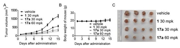 17a를 투여한 마우스모델은 체중감소 없이 동일 용량(30mpk)에서 종괴생장억제력이 69.5%로 기존 저해제 인피그라티닙을 투여한 결과(51%) 보다 더 우수한 결과를 보이고 용량에 비례하는 생체효능을 보였다.
