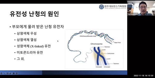 원주세브란스기독병원 이비인후과 공태훈 교수는 “가족 중 한명 이상에서 특별한 원인을 알 수 없는 난청을 앓고 있는 사람이 있다면 부모 모두 난청이 없어도 아이가 유전성 난청일 수 있다”고 말했다. 예비부부 중 ‘원인불명 또는 청각장애 가족력’이 있는 경우 난청을 의심해보고 혈액검사를 통해 난청 유전자를 확인하는 것이 중요하다고 했다.