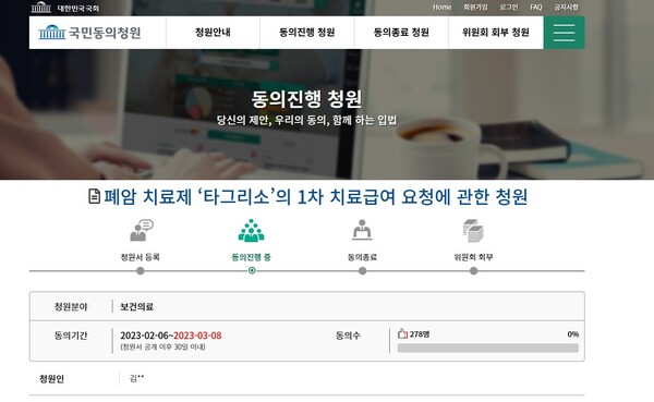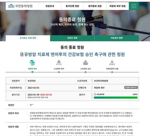 지난달 30일 올라온 ‘유방암 치료제 엔허투의 건강보험 승인을 촉구하는 청원’은 게시된 지 5일만에 5만명 이상의 국민동의를 얻어 소관위원회인 보건복지위원회에 회부됐다.