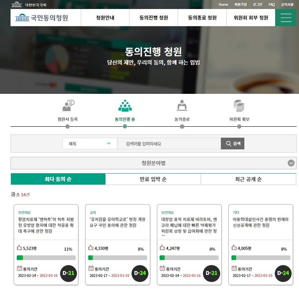 23일 13시 현재 이 청원은 4,302명의 동의를 얻었다. 5만명의 동의를 얻으면 보건복지위원회에 회부된다. 위원회 심사에 채택되면 본회의에 부의해 심의·의결이 이뤄진다.