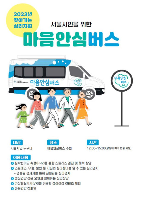 서울시정신건강복지센터는 4월부터 서울시민의 정신건강 복지 서비스 이용과 접근성 향상을 위해 ‘2023년 찾아가는 마음안심버스’를 운영한다고 14일 밝혔다.