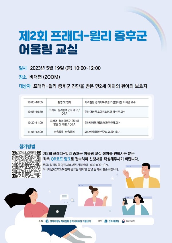 인하대병원이 운영하는 희귀질환 경기서북부권 거점센터가 오는 19일 금요일 오전 10시부터 정오까지 줌(ZOOM)을 통한 온라인 '프래더윌리증후군 어울림 교실'을 진행한다.