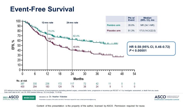 MSD는 지난 3월 초 KEYNOTE-671 연구의 공동 1차 평가변수 중 하나인 무사고생존(event-free survival, EFS) 사건에 대한 종료점 달성을 공표한 바 있는데, 이날 그 구체적인 데이터가 공개된 것이다.