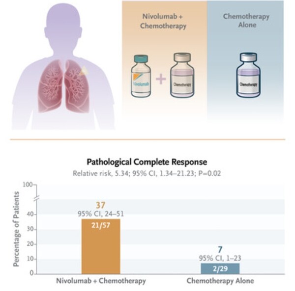 연구 결과, 절제 가능한 3A~3B기 비소세포폐암 환자에서 옵디보와 화학요법을 병용한 수술 전후 치료는 화학요법 단독 치료보다 병리학적 완전반응을 보인 환자의 비율이 더 높았고, 생존기간도 더 긴 것으로 나타났다.