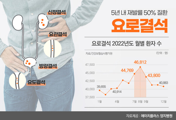 건강보험심사평가원 통계 자료를 보면, 2022년 요로결석으로 병원 치료를 받은 환자는 모두 46만 6,082명이었다. 요로결석 환자를 월별로 보면, 7~9월 여름과 초가을 환자 수가 전체 30%를 차지하면서 가장 많았다.