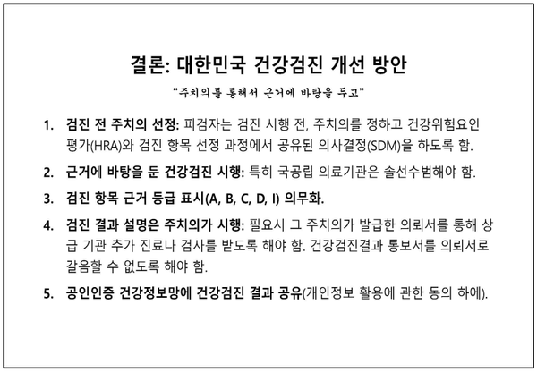 이같은 문제 해결을 위한 개선 방안으로는 ▲검진 전 주치의 선정 ▲근거에 바탕을 둔 건강검진 시행 ▲검진항목 근거 등급 표시 의무화 ▲검진 결과 설명은 주치의가 시행 ▲공인인증 건강정보망에 건강검진 결과 공유 등을 제안했다.