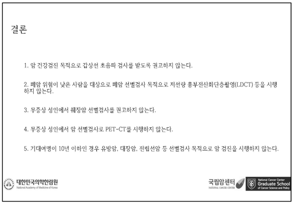 권고하지 않는 암 건강검진에는 ▲암 건강검진 목적 갑상선 초음파 검사 ▲폐암 위험이 낮은 사람 대상 폐암 선별검사 목적의 저선량 흉부전산화단층촬영(LDCT) ▲무증상 성인 췌장암 선별검사 ▲무증상 성인 암 선별검사로 PET-CT ▲기대 여명이 10년 이하인 경우 유방암, 대장암, 전립선암 등 선별검사 목적의 암 검진 등을 꼽았다.