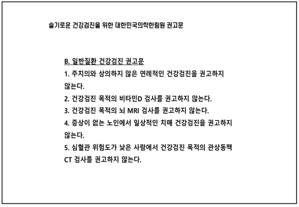 권고하지 않는 일반 건강검진으로는 ▲주치의와 상의하지 않은 연례적인 건강검진 ▲건강검진 목적의 비타민D 검사 ▲건강검진 목적의 뇌 MRI 검사 ▲증상이 없는 노인에서 일상적인 치매 건강검진 ▲심혈관 위험도가 낮은 사람에서 건강검진 목적의 관상동맥 CT 검사 등을 꼽았다.