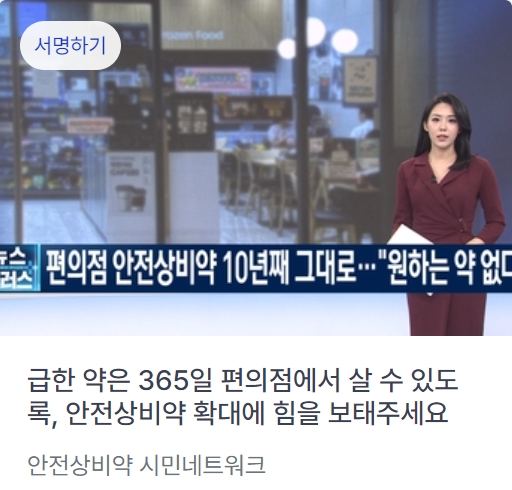 안전상비약시민네트워크는 이를 개선하기 위해 안전상비약 제도 개선 및 품목 확대에 대한 국민의 목소리를 듣는 온라인 서명 운동을 진행 중이라고 19일 밝혔다. 온라인 서명은 디지털 시민 광장으로 운영되는 캠페인즈에서 가능하다.