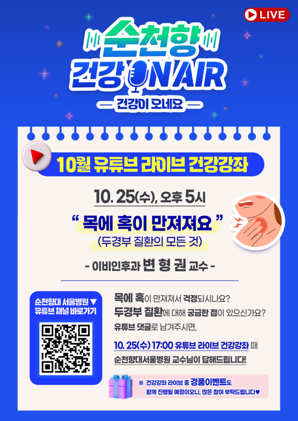 순천향대병원이 유튜브 생방송 ‘건강 On Air’ 코너를 마련해 25일 오후 5시 병원 공식채널 Human Love(휴먼러브)에서 시청자와 실시간 소통을 진행한다고 23일 밝혔다.