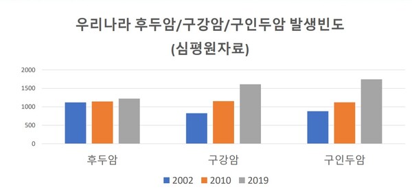 학회에 따르면 2002년, 2010년, 2019년을 비교했을 때 우리나라 두경부암의 경우 후두암은 비슷하게 유지되고 있으나 구강암과 구인두암은 빠르게 증가하고 있다.