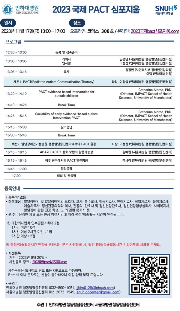 인하대병원 행동발달증진센터 이정섭 센터장(정신건강의학과 교수)이 전체 심포지엄의 좌장을 맡고, PACT 치료 권위자인 영국 맨체스터대학 캐서린 알드레드 박사가 참석해 강연을 하며 이후 순서에서는 국내에서 PACT의 활용법에 대해 논한다.