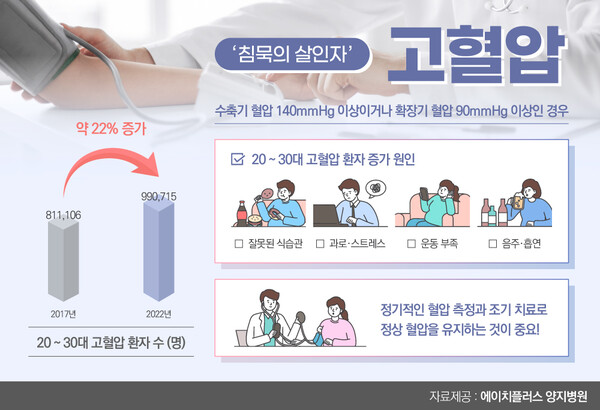 에이치플러스 양지병원 최원호 순환기내과 전문의는 “고혈압은 혈압 관리가 핵심인 만큼 꾸준히 혈압을 측정해 정상범위를 유지하도록 노력하는 것이 중요하다”며 “젊은 연령층일수록 나이 들어 생기는 고혈압보다 합병증으로 인한 장기 손상 위험이 높아 전문의와 상담으로 빠른 치료와 관리가 필요하다”고 말했다.