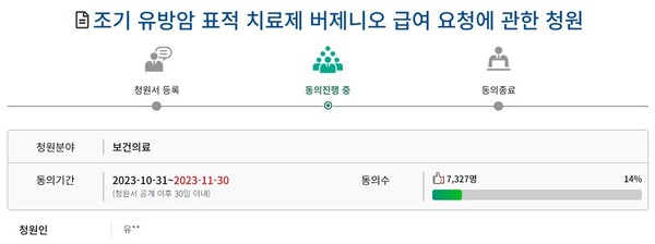 최근 국민동의청원 게시판에는 조기 유방암 표적치료제 버제니오 급여 등재를 촉구하는 청원이 동의 안건으로 올라왔다. 오는 30일까지 진행되는 해당 안건에 현재 7,327명이 동의했다.