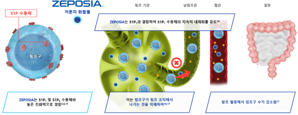 제포시아는 성인의 중등증에서 중증의 활동성 궤양성 대장염에 사용되는 새로운 기전의 신약으로 S1P 수용체 조절제다. 면역세포 일종인 림프구의 S1P 수용체를 표적해 말초혈액 내 림프구 수를 감소시키는 것으로 알려졌다. 이 같은 기전은 장으로의 림프구 이동 감소를 불러와 궤양성 대장염 치료에 효과를 내는 것으로 추정되고 있다.