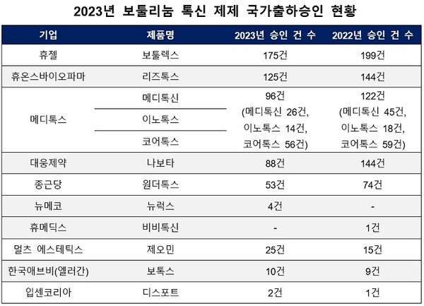 국내사 보툴리눔 톡신 제제 국가출하승인 건수는 2022년 대비 모두 줄었다. 국내사 가운데 가장 많은 국가출하승인을 받은 휴젤 보툴렉스는 175건으로 전년 199건 대비 12.1% 줄었다. 휴온스바이오파마 리즈톡스는 125건으로 전년 144건 대비 13.2% 감소했다. 메디톡스는 메디톡신 26건, 이노톡스 14건, 코어톡스 56건으로 모두 96건으로 전년(122건) 대비 27.1% 줄었다.