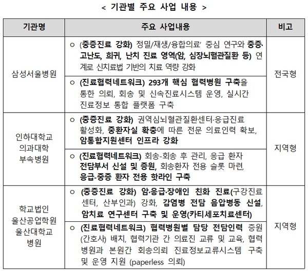 중증환자들이 필요한 때 적시에 진료를 받을 수 있도록 삼성서울병원, 인하대병원, 울산대병원 등 상급종합병원 3개소를 대상으로 '중증진료체계 강화 시범사업'이 실시된다.