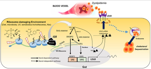 실험동물 및 오가노이드 모델 분석 결과, 리보솜 스트레스 반응이 지질인자의 비정상적 구성을 야기하며, 저밀도콜레스테롤 수용체 등을 통해 장 및 장간막으로 혈중 콜레스테롤의 선택적 유입을 유발했다.