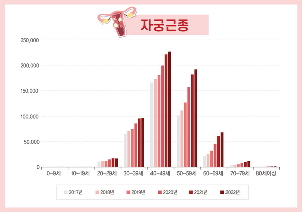 자궁근종 환자는 계속 늘고 있다. 2018년 39만 2,334명에서 2022년 60만 7,526명으로 5년 전과 비교 66% 이상 환자가 늘었다. 환자들을 연령대별로 보면, 가임 연령대인 30~40대가 32만 3,506명으로 전체 자궁근종 환자의 50% 이상을 차지했다. 50대도 증가세를 보였다.