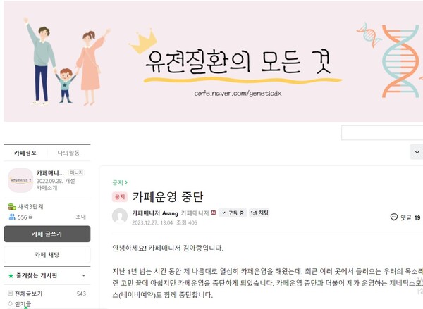 김아랑 운영자는 “미국에서 유전상담사로 일하며 그동안 카페를 운영해왔던 것은 유전상담 서비스의 제도화를 위해, 제도화될 때까지 한국의 희귀질환 환자와 가족들에게 조금이나마 보탬이 되고자 하는 마음 때문이었다”며 “하지만 최근 여러 곳에서 들려오는 우려의 목소리로 인해 카페를 중단하고자 한다. 카페와 더불어 제네틱스모드 상담서비스(네이버 유료 유전상담서비스)도 함께 중단한다”고 밝혔다.