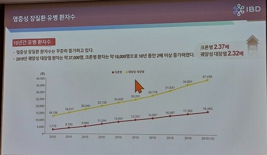 염증성 장질환은 장관 내 비정상적인 면역반응과 내외부적 요인으로 만성 염증이 호전과 재발을 반복하는 질환으로 궤양성대장염과 크론병이 대표적이다. 염증성 장질환이 과거 동양인에서는 비교적 드문 질환이었으나, 국내에서 서구화된 식습관을 비롯하여 다양한 이유로 지속적으로 증가하는 추세를 보이고 있다. 2010년에서 2019년까지 10년 간 크론병 환자는 2.37배, 궤양성대장염 환자는 2.32배 증가한 것으로 알려졌다.