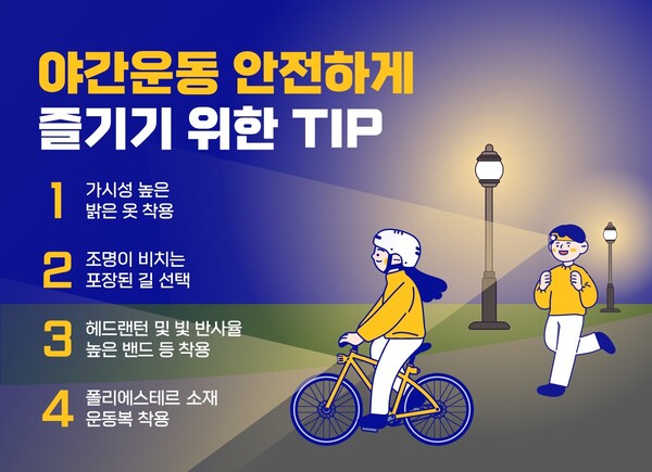 한편 달리기나 자전거 타기 등 야간에 비교적 고강도 운동을 할 때는 주변 환경을 살피고 안전 수칙을 잘 지켜 안전사고에 더 신경을 써야 한다.
