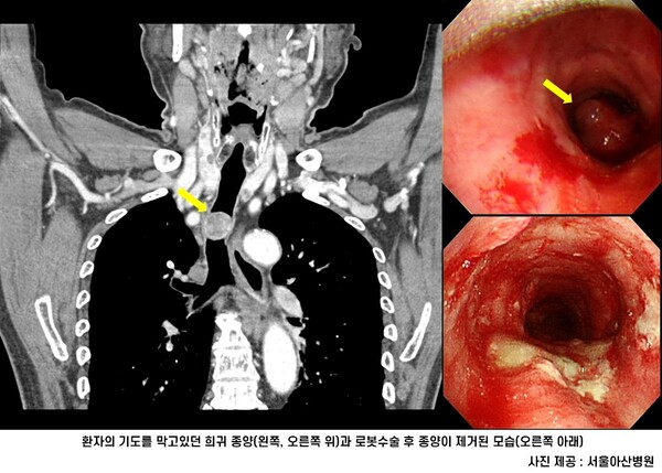 서울아산병원은 심장혈관흉부외과 김용희· 호흡기내과 지원준·병리과 안보경 교수팀이 전세계에서 3건만 보고된 희귀성 기관(trachea) 내 종양으로 인해 심한 호흡곤란이 동반된 환자에게 최근 로봇을 이용한 기관절개 및 재건술을 국내 처음으로 성공했다고 24일 밝혔다.