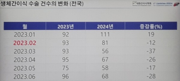 29일 대한간이식학회가 연 추계학술대회 기자간담회에서 김석환 정보위원장(충남대병원 간담췌외과 교수)은 "의정갈등이 일어난 2월부터 전공의뿐만 아니라 전임의가 사직하면서 학회 차원에서 전국 생체간이식 증감률을 조사해본 결과, 2023년엔 거의 월별 90건 이상이 이뤄졌지만 2024년에는 지속적으로 감소하는 추세"라며 이같은 현실을 지적했다.