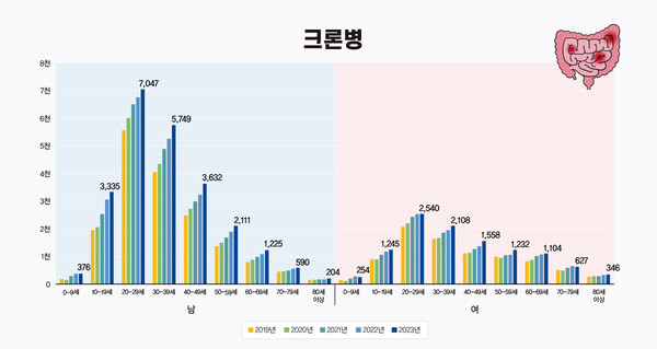 이후 크론병 환자들은 계속 증가해 현재 국내에는 2만~2만 5천 명 정도의 환자들이 있는 것으로 추정된다. 전체 인구 규모로 보면 적은 수는 아니다. 크론병은 완치가 어렵고 평생 관리해야 하는 질환으로 유병률은 점차 증가할 것으로 예상된다. 2023년 크론병으로 병원 치료를 받은 환자는 3만 3,238명이다. 2019년 2만 4,133명에 비해 27% 이상 늘었다.