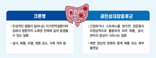 복통이나 설사 등 크론병 증상은 과민성대장증후군과 혼동될 수 있어 주의가 필요하다. 크론병 증상은 과민성대장증후군과 상당 부분 유사하다. 잦은 복통과 설사로 두 질환을 혼동하는 경우가 많다. 크론병은 소화관 외 다른 증상을 동반하기도 한다. 대표적으로 눈에 이상이 있다든지 피부 발진과 관절통을 동반하는 등 장관 외 증상이 있으면 크론병을 의심해야 한다.