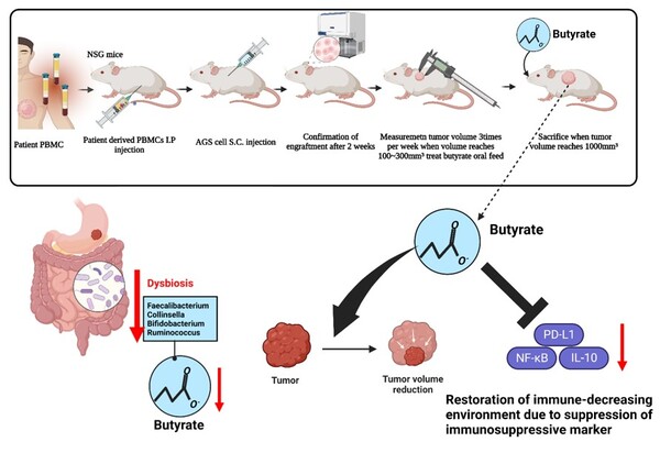 연구팀은 장내균총이 분비하는 대사산물인 부티레이트가 위암 세포에 어떤 영향을 주는지를 확인하기 위해 위암 아바타 모델(위암 환자의 면역세포를 이식한 마우스)을 활용했다. 그 결과 부티레이트가 생체 내(in vivo) 모델에서도 위암 세포의 PD-L1과 IL-10의 발현을 억제시키는 것을 확인할 수 있었으며, 암 촉진을 억제하는 항 종양 효과가 있음을 입증했다. 그 동안 부티레이트의 항 종양 효과는 연구돼 왔지만, 위암 모델에서의 구체적인 효과가 확인된 것은 이번이 처음이다.