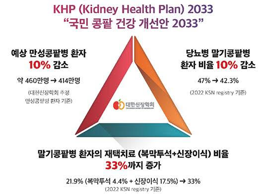 KHP 2033을 통해 2033년까지 만성콩팥병 환자 수를 414만 명으로 줄이고, 당뇨병 말기콩팥병 환자 비율 또한 42.3%까지 낮추겠다는 게 신장학회의 방침이다.