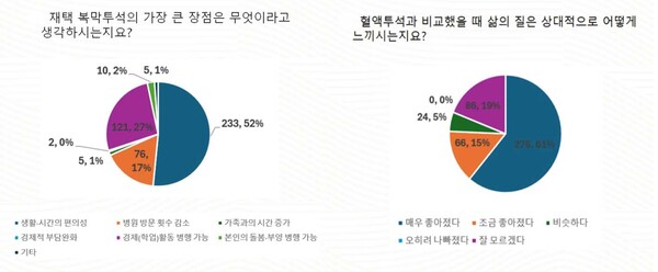 재택 복막투석의 장점으로는 ▲생활, 시간의 편의성이 52%로 가장 높았다. 그 다음이 ▲경제(학업)활동 병행 가능(27%) ▲병원 방문 횟수 감소(17%) ▲본인의 돌봄·부양 병행 가능(2%) 등의 순이었다. 이외에 ‘집이라는 편한 공간에서 휴식과 더불어 치료함으로써 심리적 안정이 된다’, ‘음식을 섭취하는데 제한을 많이 받지 않는다’는 답변도 있었다.