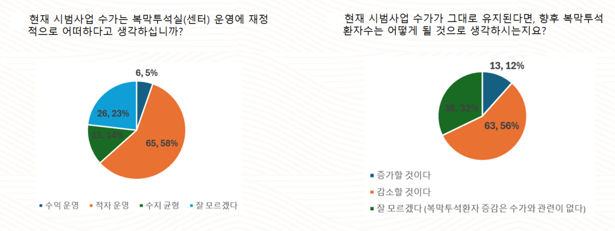 ‘현재 시범사업 수가는 복막투석실(센터) 운영에 재정적으로 어떤지’ 물음에 응답자의 58%가 적자라고 답했으며, 현 수가 체계로는 ‘복막투석 환자 수 유지가 어렵다’(56%)고 경고했다.