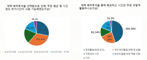 재택 복막투석을 시작하면서 경제활동이나 학업에 영향이 있었는지 묻는 질문에는 ‘어려워졌다’는 응답은 5%에 불과한 반면 전혀 영향이 없거나(17%), 있지만 유지가 가능하다(78%)는 답변이 95%에 달했다. 특히 이들은 복막투석을 선택함으로써 주 20시간의 추가시간이 생겼으며, 확보한 시간은 45%가 경제활동, 23%가 개인 취미활동(여행 및 외출), 16%가 돌봄·부양, 14%가 가족과의 시간 등에 활용하고 있다고 응답했다.