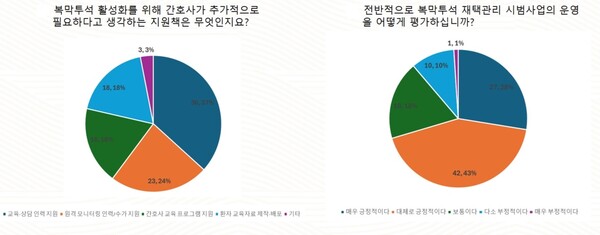 간호사들은 복막투석 시범사업을 ‘본사업으로 전환하는 것이 필요하다‘고 응답했으며(78%), 복막투석 활성화를 위해 ‘인력·수가 지원이 필요하다’(61%)고 답했다. 특히 본사업 전환 시 반드시 개선돼야 할 주제로 ▲전담 간호사 인력 확충(71%) ▲교육·상담 수가 현실화(72%)를 꼽았다.